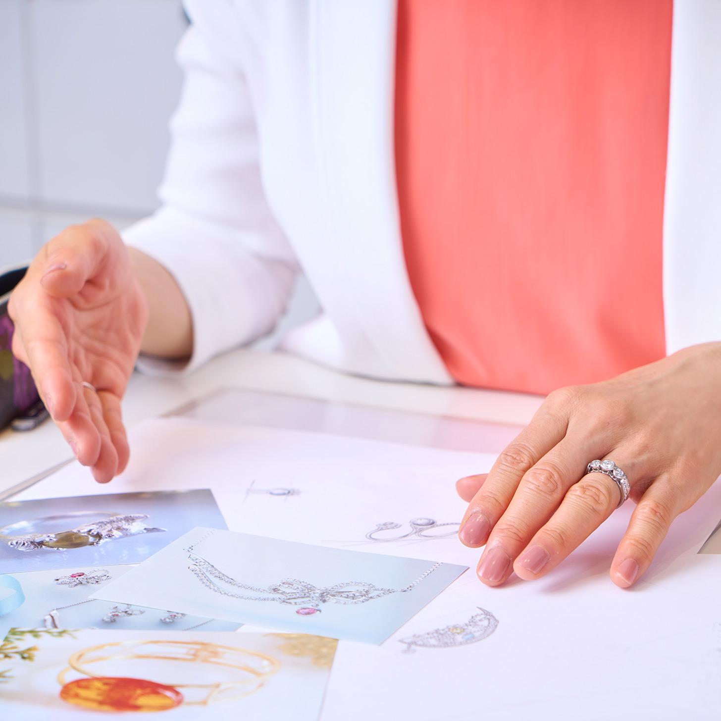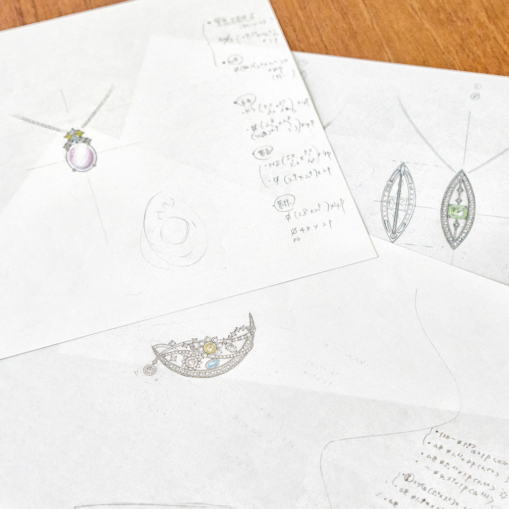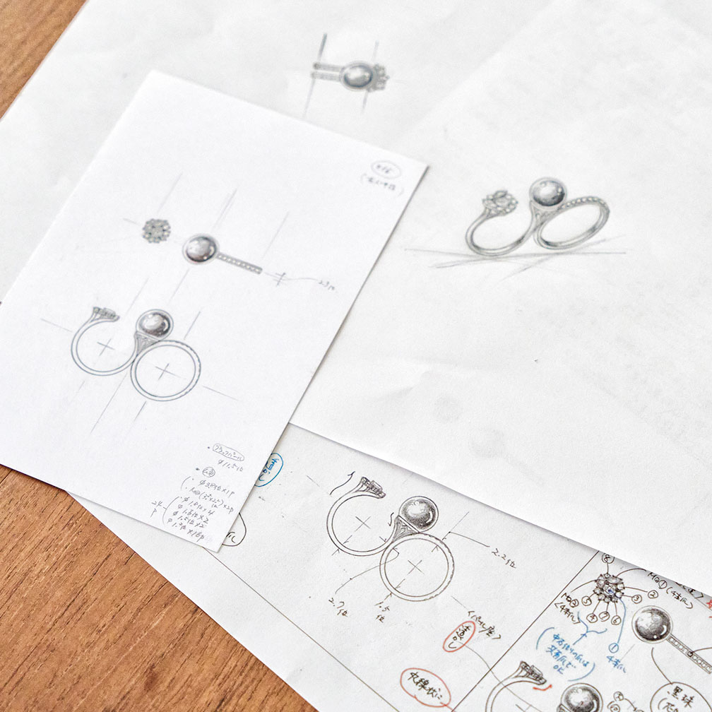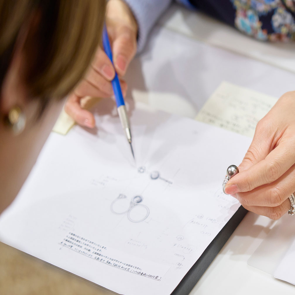「時間をかけてお客様のご要望を伺い、オーダーの流れや予算などを伝えます。大切にしていることは、お客様の立場に立って誠意を持って対応していくこと。まずはお客様の想いを最優先に、お似合いになる、より美しくなるデザインを考え、確認しながら進めていきます。何を作りたいか決まっていなくても、普段どんなジュエリーをつけているのか伺ったり、お召し物や雰囲気から“その人らしさ”を感じ取り、一緒にカタチにしていきます。