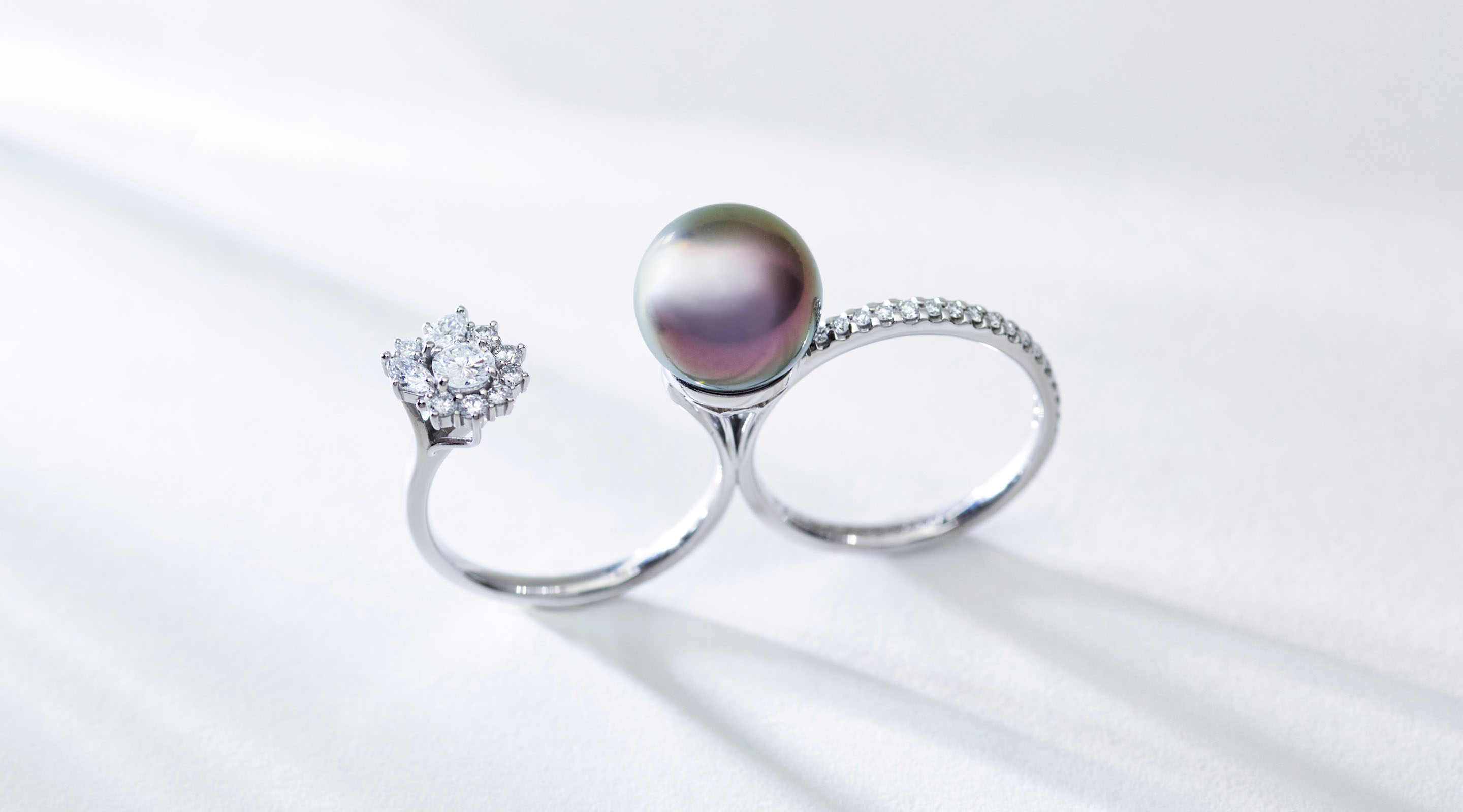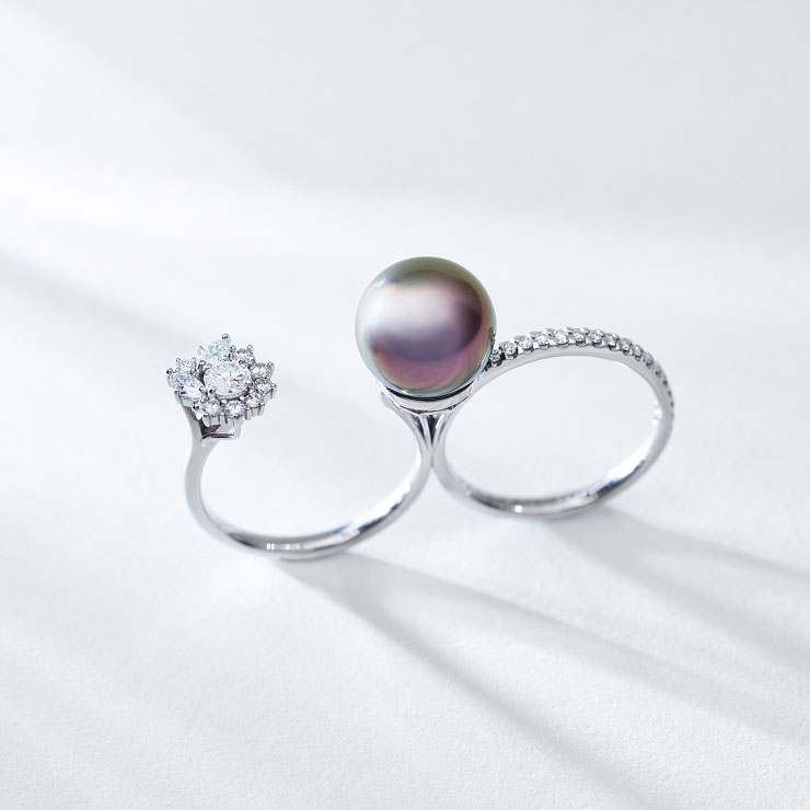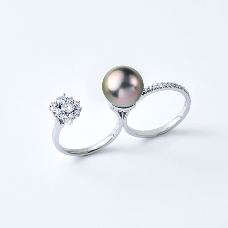 望月さんの場合は、画像などでお好みが把握できましたので、“おしゃれ感があり、スタイリッシュ”、“細身”、“オープンリング”をキーワードにデザインしました。シンプルでも普通すぎないよう、ダブルフィンガーのオープンリングに。ブラックパールを立体的にセットし、サイドの透かし部分は西洋のクラシックな建築物を彷彿とさせるデザインに仕上げました。