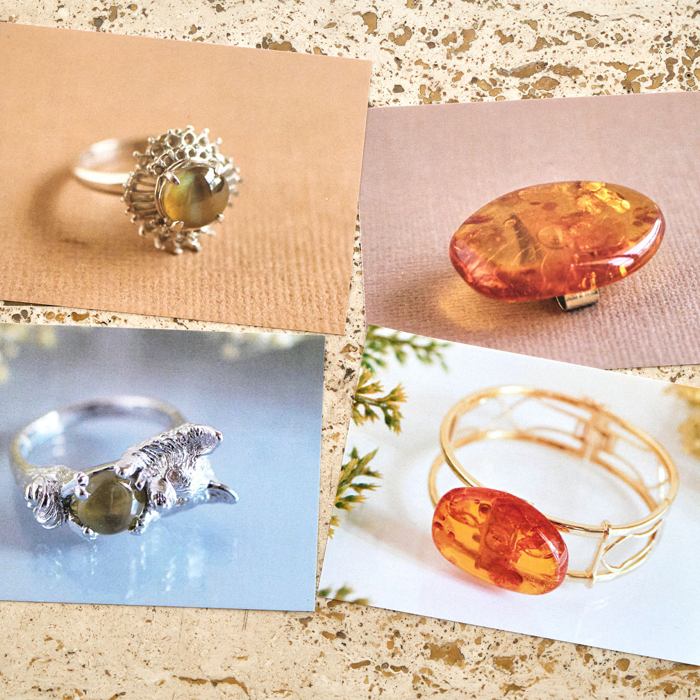 形見のジュエリーをリフォームする方も多いそう。お父様の琥珀のループタイをバングルに、お姉様のリングを亡くなった愛犬をイメージしたリングに。