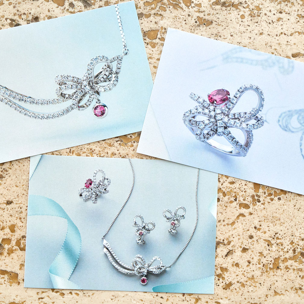 下池デザイナーの代表作のひとつである、甘すぎない大人のためのリボンシリーズ。立体や構造を工夫し、新鮮で見栄えのするデザインが特徴。